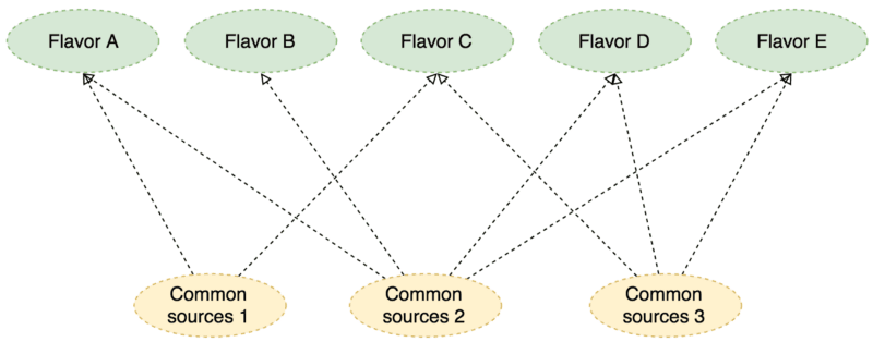 Let’s assume we have 3 flavors: flavor A, flavor B & flavor C. Flavor A & flavor B share some common resources. We could create a separate flavor dimension for the shared part. E.g.: